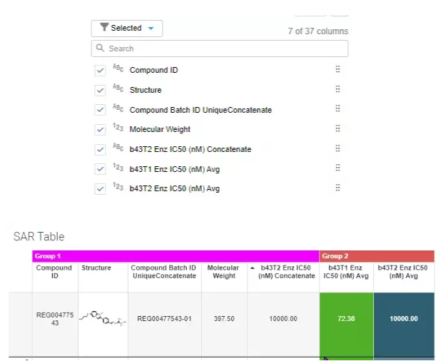 En la aplicación de análisis SAR, las columnas ahora se pueden reordenar en diferentes grupos de columnas de ChemCharts.