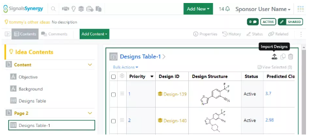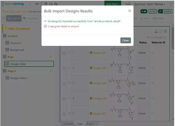En Synergy, los usuarios ahora pueden importar diseños de forma masiva desde archivos SDF y CSV con información de estructura SMILES o InChl (codificación UTF8). En una tabla de diseños, seleccione Importar diseños.