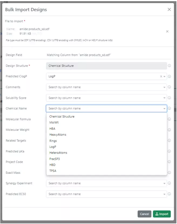 A continuación, el usuario puede cargar un archivo SDF o CSV y asignar las columnas a los campos Diseño.
