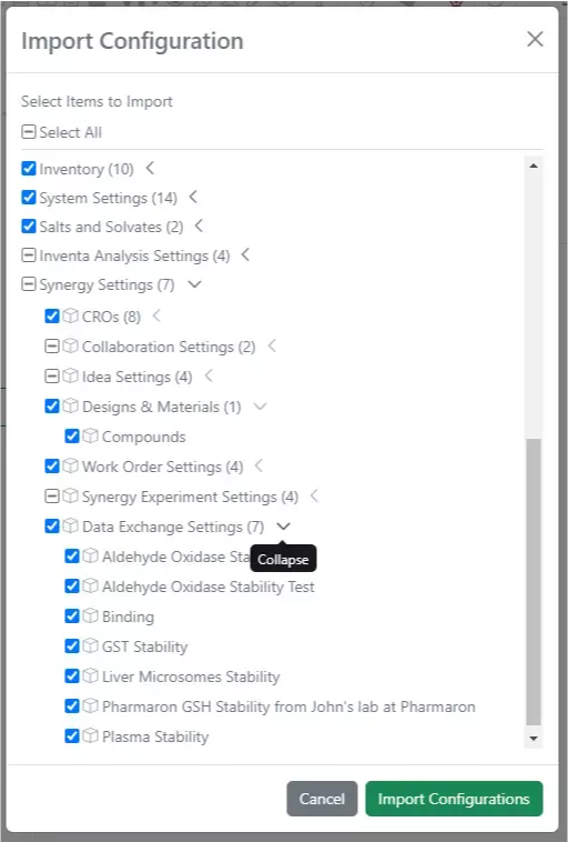 En el aspecto administrativo, las transformaciones de la biblioteca de intercambio de datos de Synergy, así como las definiciones de diseños y tablas de referencia, ahora se pueden transferir de un inquilino a otro mediante la transferencia de configuración en la configuración de señales. Después de cargar un archivo de configuración, las transformaciones de Data Exchange disponibles del inquilino de origen se mostrarán en Configuración de sinergia > Configuración de Data Exchange. Al seleccionar una transformación, se transferirán los detalles, ejemplos, archivos adjuntos y otros ajustes de configuración para esa transformación. Además, en Configuración de Sinergia > Diseños y Materiales, al seleccionar un Tipo de Material se transferirán los ajustes de la Definición de Diseño, la Tabla de Diseños y la Tabla de Referencia para Diseños, Activos de Material y Lotes de Material para el Tipo de Material seleccionado. (Tenga en cuenta que la definición de registro de material, la configuración de la tabla de materiales y otras configuraciones que no sean de sinergia para el tipo de material no se verán afectadas por esta selección. Esas configuraciones se pueden transferir seleccionando el Tipo de material en la sección general Materiales sobre la Configuración de sinergia).
