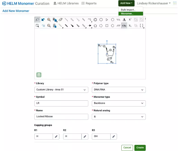 La adición de un solo monómero a la vez a una biblioteca de monómeros personalizada en la aplicación HELM Monomer Curation (HMC), anteriormente disponible en versión beta, ahora está disponible para todos los sistemas. Las estructuras de monómeros se pueden dibujar y editar directamente dentro de HMC, y todas las propiedades de los monómeros se pueden definir en el formulario 'Agregar nuevo monómero'.