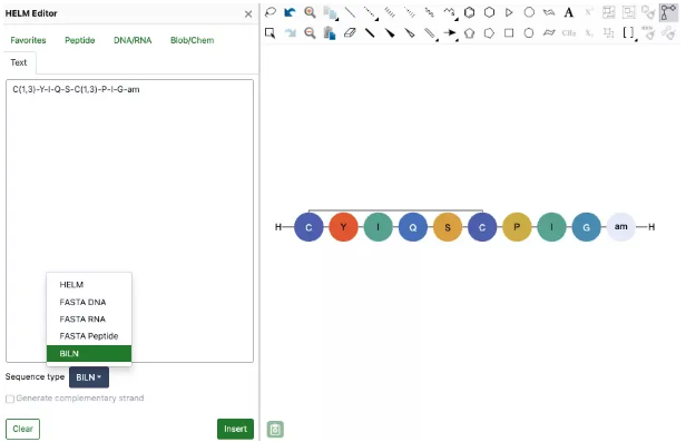 Ahora se admite el formato BINN, una notación de línea legible por humanos para péptidos complejos. Los usuarios pueden crear péptidos complejos pegando una cadena BILN en el lienzo de ChemDraw o insertando una cadena BILN usando la pestaña de texto en el editor de HELM. Además, también se ha añadido la compatibilidad con 'Copiar como', lo que permite a los usuarios generar una cadena BILN a partir de una secuencia de péptidos dibujada en el lienzo.