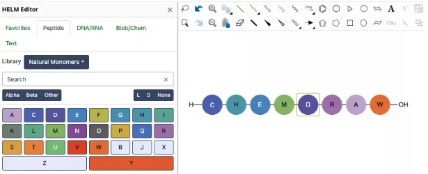 Las teclas de acceso rápido ahora son compatibles cuando se usa el editor de HELM. Al editar una secuencia en el lienzo, se puede insertar cualquier monómero de la biblioteca de monómeros seleccionada con un símbolo de una sola letra presionando la tecla correspondiente en el teclado. Del mismo modo, cualquier monómero seleccionado mientras está en el modo de edición HELM se puede reemplazar presionando un monómero válido de una sola letra de la biblioteca seleccionada. Por ejemplo, cuando la pestaña 'Péptido' está activa en el Editor HELM y se selecciona la biblioteca 'Monómeros naturales', al presionar 'a' se insertará el monómero A (alanina) o se reemplazará el monómero existente con A (alanina). La compatibilidad con teclas de acceso rápido HELM está disponible en las pestañas Péptido, ADN/ARN y Blob/Chem del editor de HELM.