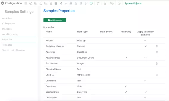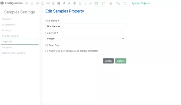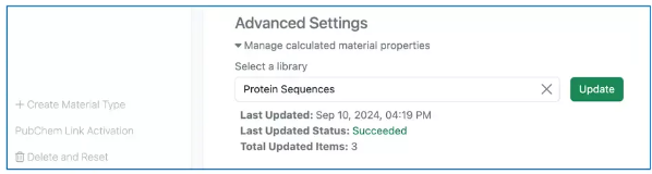 Los administradores ahora pueden actualizar automáticamente las propiedades calculadas para un tipo seleccionado de materiales. Esto ejecutará las propiedades calculadas para las bibliotecas de sustancias químicas y proteínas, incluidos los nombres de las sustancias químicas calculadas. La configuración está disponible en Configuración avanzada en la página Configuración de materiales. Los administradores pueden designar la biblioteca y confirmar que desean volver a calcular los campos de ese conjunto de materiales. Una vez completado el proceso, se mostrará la última actualización y el número de materiales actualizados. En este punto, el Administrador puede actualizar Materiales adicionales.
