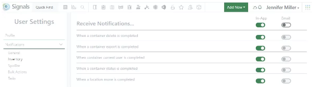 Las notificaciones de usuario para el inventario se pueden encontrar en Configuración de usuario/Notificaciones/Inventario.