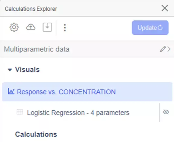 El panel principal del Explorador de cálculos ahora muestra dos grupos simples y claramente identificados para las visualizaciones y los cálculos. Las visualizaciones se pueden activar o desactivar mediante el icono del ojo y las fórmulas de los cálculos se presentan en la pestaña Detalles del panel derecho.