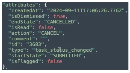 Para los cambios de estado de la tarea, verá "startState" y "endState" en el objeto "properties".