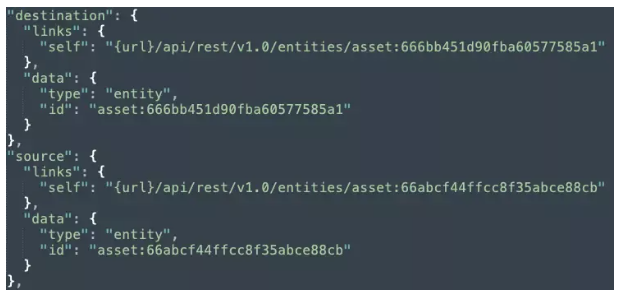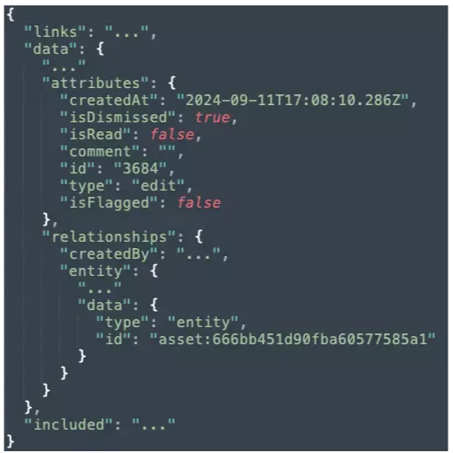 Para ediciones o eliminaciones de activos o lotes, verá un "tipo" de "editar" o "papelera" respectivamente. El objeto "incluido" incluirá la entidad.