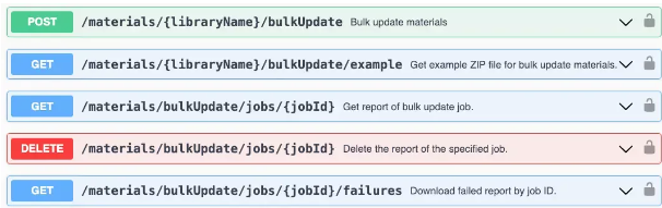 Esta es una API asíncrona que se inicia con "POST /materials/{libraryName}/bulkUpdate". Esta API admite la actualización de datos en un archivo ZIP. El archivo ZIP debe contener un archivo SDF de resumen o un archivo CSV y archivos adjuntos.