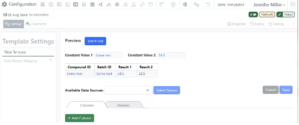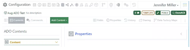 Los usuarios pueden publicar datos de los experimentos de Signals Notebook en Inventa. Para habilitar el envío de datos, hay una configuración administrativa que deberá realizarse tanto para Inventa como para Signals Notebook. Los requisitos previos para Inventa son un proyecto y un tipo de medición definido. Los requisitos previos para Signals Notebook son una tabla definida por el administrador (ADT) y (o ambos) un objeto definido por el administrador (ADO) o una plantilla de experimento. Navegue hasta el ADT que se va a publicar. Haga clic en Configuración en la esquina superior izquierda para exponer el menú Configuración de plantilla: