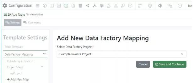 En el encabezado Asignación de Data Factory, elija + Agregar nueva asignación. Asocia el mapa con el Proyecto Inventa: