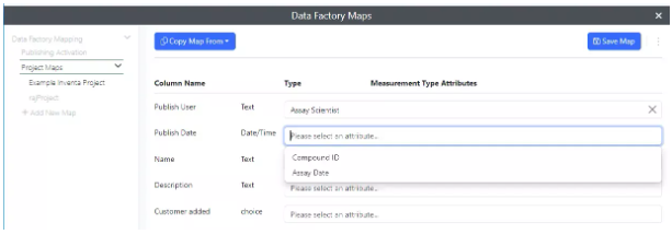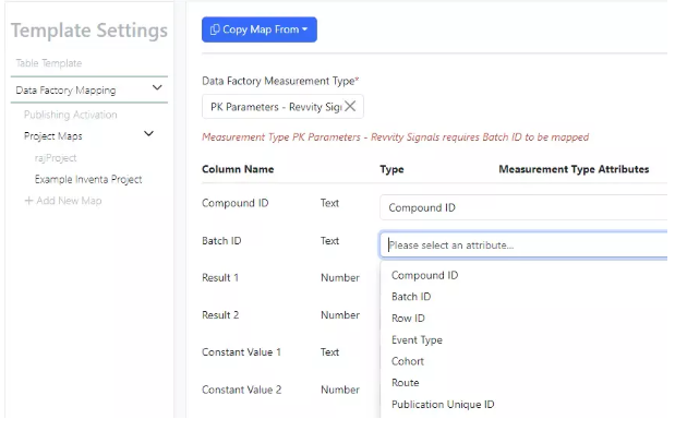 Asigne el nombre de la columna ADT al atributo de tipo de medición correcto. El tipo de columna coincidirá automáticamente con el atributo de tipo de medición. Si el atributo Tipo de medición requiere el ID de lote, habrá una advertencia. El ID de lote se puede establecer en el ADT o desde la plantilla de ADO/experimento.