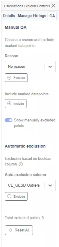 El panel derecho del Explorador de cálculos se ha actualizado en el nivel de la pestaña QA, que ahora contiene secciones claramente identificadas para el control de calidad manual o automatizado. Además, la información en el panel Detalles ahora es estrictamente de solo lectura.