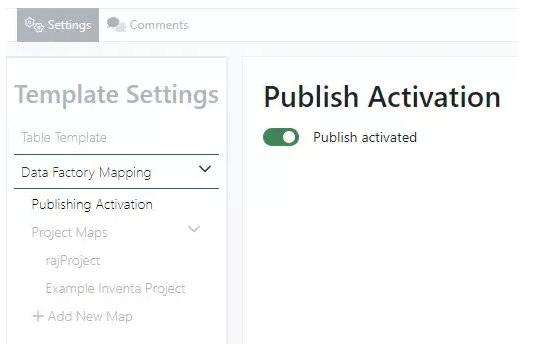 Guarde el mapa. Se pueden crear mapas adicionales, según el proyecto Inventa. A medida que se seleccione cada proyecto, se actualizará la lista de proyectos disponibles. Una vez que se hayan creado todos los mapas, active la publicación seleccionando la página Activación de publicación: