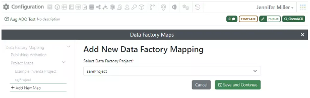 Antes de que los usuarios puedan publicar desde el ADO/Experimento, se debe crear un mapa de proyecto correspondiente. Vaya a la plantilla ADO/Experimento. En la esquina superior derecha, haga clic en Data Factory Maps: