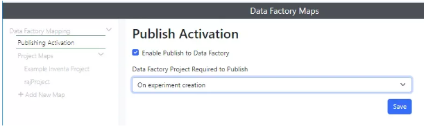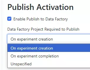 Hay 3 opciones. Sin especificar significa que los usuarios pueden navegar a las propiedades de ADO/Experimento y seleccionar el proyecto en cualquier momento. Haga clic en Habilitar publicación en Data Factory cuando haya terminado para permitir que los usuarios publiquen desde un ADO o experimento: