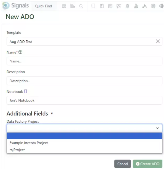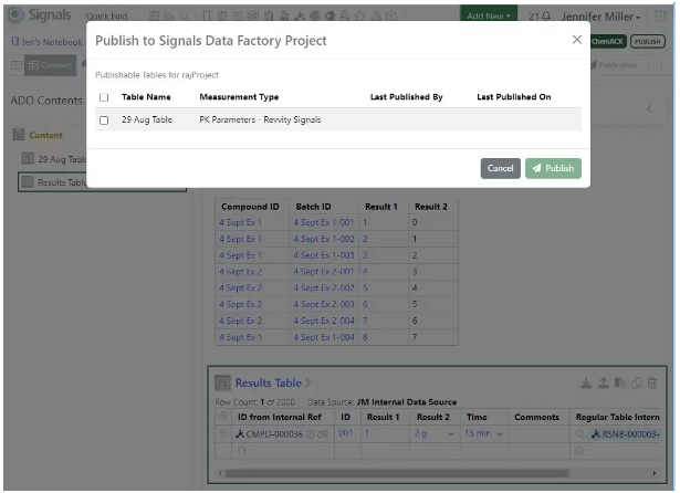 El usuario puede agregar tantos ADT como sea necesario al ADO/Experimento. Solo los ADT que se hayan asignado al mismo proyecto que el ADO/Experimento se mostrarán en la pantalla para que se publique la selección. La primera vez que se publica la(s) tabla(s), la(s) última(s) publicada(s)... estará en blanco: