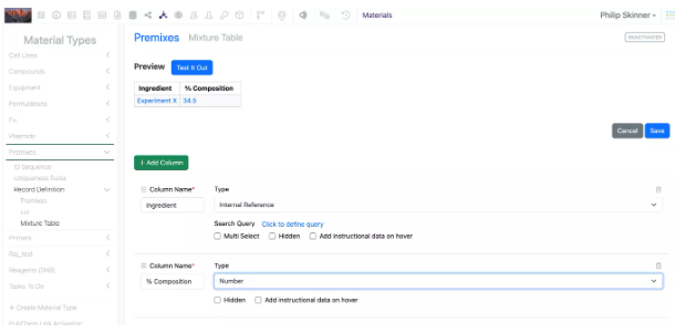 La biblioteca permite al administrador definir propiedades, reglas de unicidad y activación, como lo hacen para otras bibliotecas personalizadas. El administrador también puede definir una tabla para los datos de composición de la mezcla.