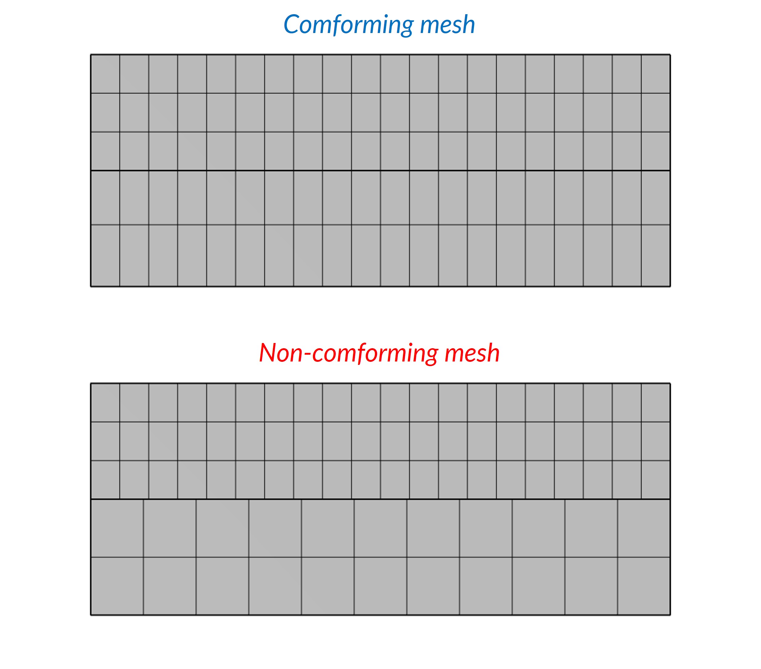 En COMSOL Multiphysics® una malla conforme (conforming mesh) es aquella en la que los nodos y elementos se ajustan exactamente a las fronteras y geometrías del dominio del modelo (ver la Figura de la portada que presenta la comparación entre una malla conforme y otra no conforme), presentando las siguientes características principales: