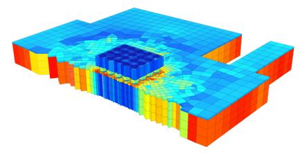 Este modelo de un chip de silicio soldado en una placa de circuito impreso se malló utilizando la funcionalidad de mallado de barrido mejorado disponible en COMSOL Multiphysics. Se muestra la calidad de los elementos donde el rojo representa un elemento completamente simétrico.