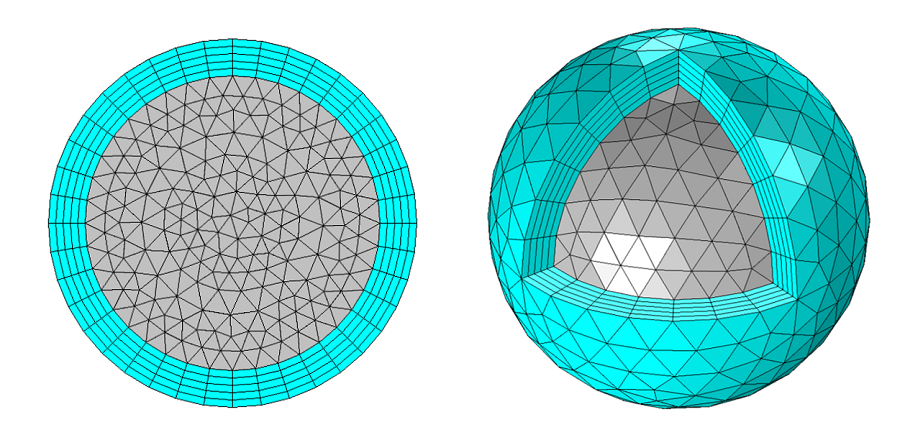 Matemáticamente hablando, la PML es simplemente un dominio que tiene unas permitividad y permeabilidad complejas y anisotrópicas. Para un ejemplo de una derivación completa de estos tensores, por favor, vea por ejemplo la referencia "Theory and Computation of Electromagnetic Fields". Aunque los PML son teóricamente no reflectantes, muestran cierta reflexión debido a la discretización numérica: la malla. Para minimizar esta reflexión, queremos utilizar una malla en la PML que se alinee con la anisotropía en las propiedades del material. Debajo se muestran las mallas PML adecuada, para dominios circular 2D y esféricos 3D. Las PML cartesianas y esféricas y su uso apropiado también se discuten en la documentación del producto.