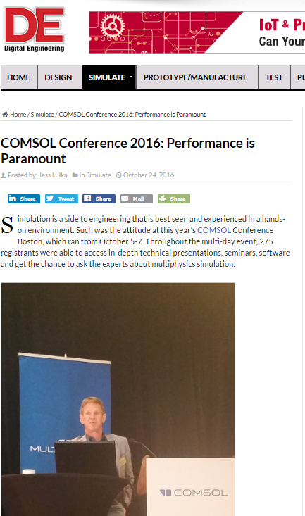 La revista Digital Engineering se ha hecho eco de la celebración a principios de este mes de octubre en Boston de la conferencia americana de COMSOL, y comenta detalles sobre lo que se discutió en ella, además de las novedades introducidas en la última versión de COMSOL Multiphysics 5.2a y su potente funcionalidad para generar apps de simulación para todos aquellos que no son expertos en simulación.