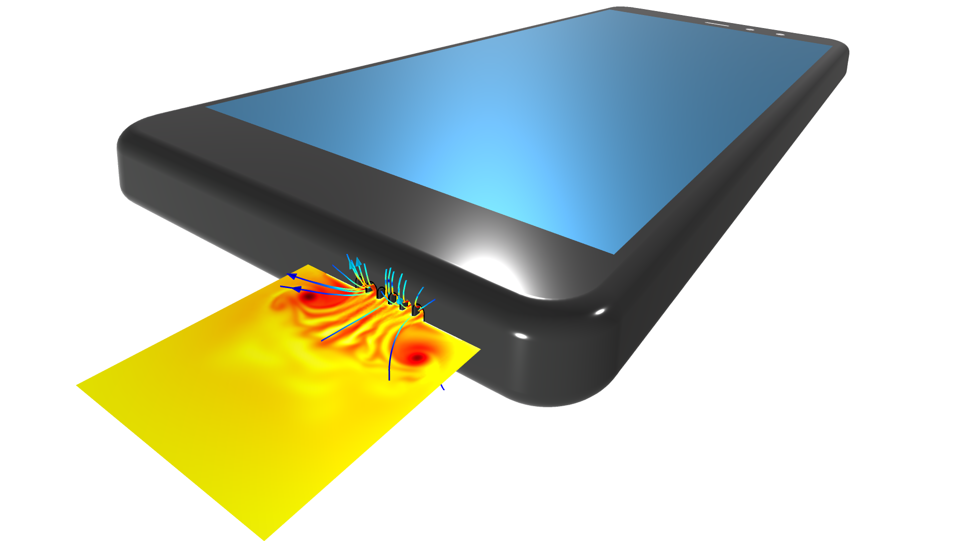 La velocidad acústica y las perturbaciones térmicas que muestran el desprendimiento de vórtices cuando una onda de presión de gran amplitud interactúa con una rejilla con pequeñas rendijas estrechas. Este tipo de efecto acústico termoviscoso no lineal es importante en el análisis de altavoces de dispositivos móviles de alta fidelidad.
