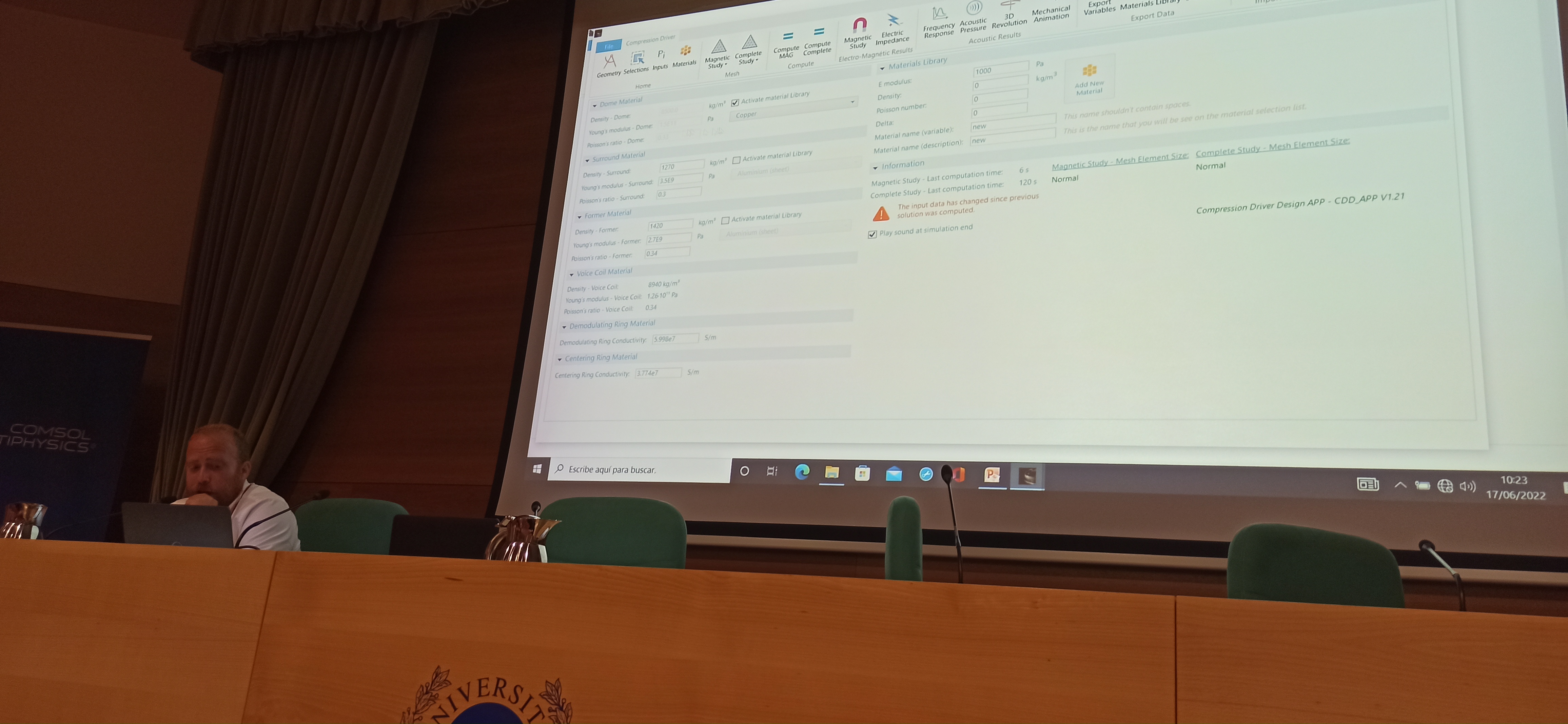 A continuación, en la sesión plenaria, Rafael Serra Giménez de la empresa ACUSTICA BEYMA ha presentado varias aplicaciones compiladas de COMSOL para la optimización del diseño de altavoces de varios tipos, introduciendo algoritmos genéticos propios.