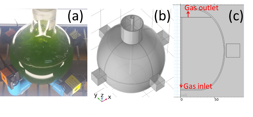 Figura 1: (a) Matraz de Balón conteniendo un medio de cultivo con un arreglo de imanes alrededor [2]. (b) Modelo 3D. (c) Modelo 2D axisimétrico a partir de (b).
