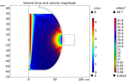 Figura 2: Magnitud de la velocidad del fluido y fuerza volumétrica debido a la presencia de un imán permanente.