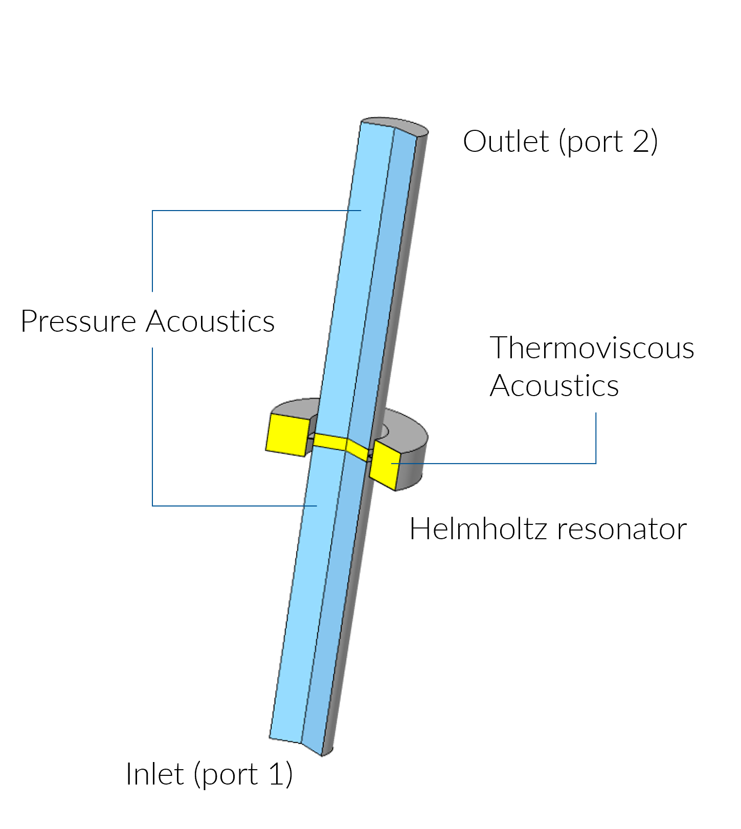 Otro ejemplo de los conceptos de Noether descrito en la sección anterior es el de la conservación de la energía, conservación del momento lineal y conservación del momento angular. En la Galería de Aplicaciones de COMSOL se encuentra el modelo tutorial que ilustra la conservación de energía cuando se utiliza la interfaz de física Thermoviscous Acoustics, Frequency Domain. El modelo en particular consiste en una pequeña configuración de prueba conceptual de un tubo principal con un resonador Helmholtz [2] (Figura 2).