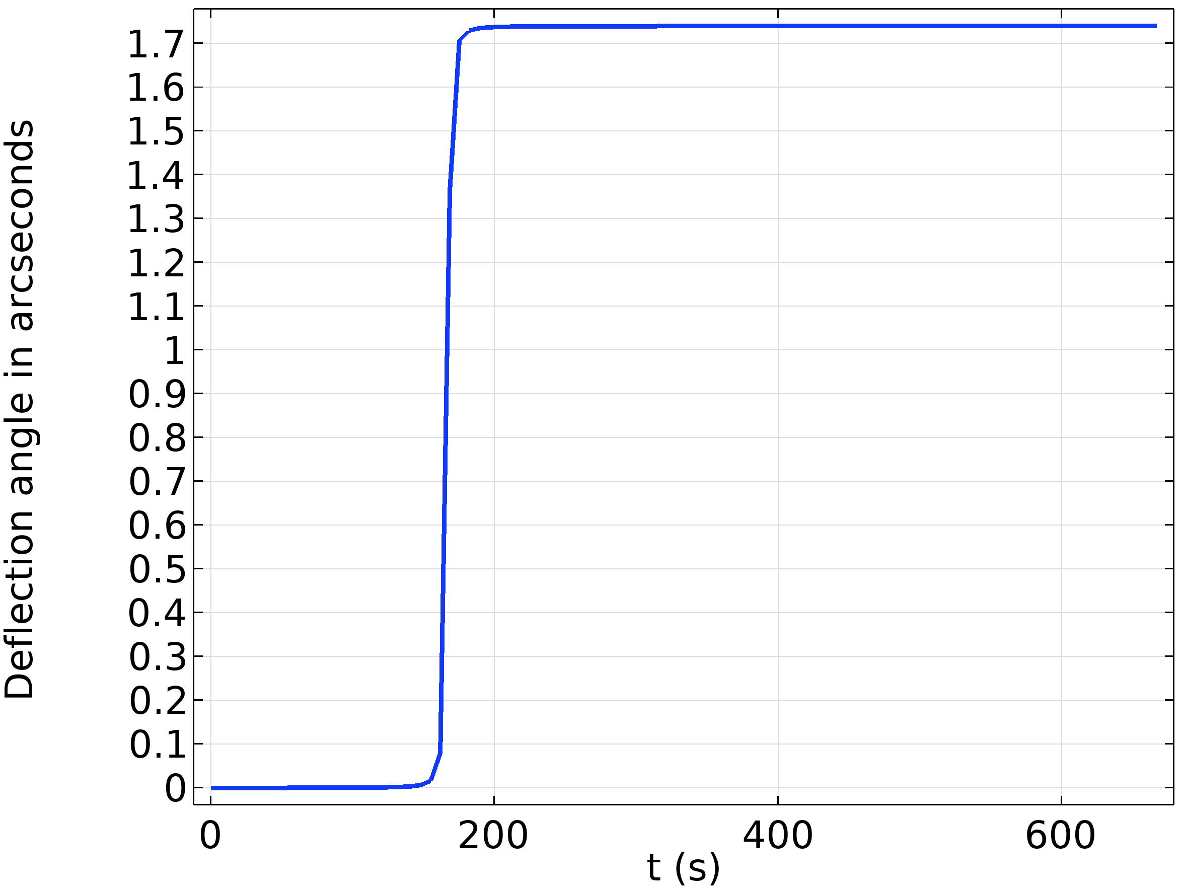 El cambio angular en la dirección de los rayos se representa en la Figura 2. Después de la liberación, los rayos necesitan alrededor de 165s para llegar al sol. Los rayos entonces comienzan a desviarse de su dirección inicial debido al gradiente en el índice de refracción. El valor final es de aproximadamente 1,75 segundos de arco, consistente con la predicción de Einstein.