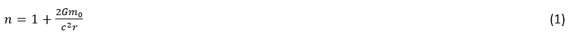 COMSOL permite estudiar fenómenos donde la Teoría de la Relatividad entra en juego. Por ejemplo, el efecto de lente gravitacional [1] se modela usando un índice de refracción que varía continuamente en el espacio, lo cual se conoce como medio graduado. El índice de refracción, n, depende de la constante gravitacional G (unidad SI: m3/(kg·s2), la masa solar m0 (unidad SI: kg), la velocidad de luz c (unidad SI: m/s), y la distancia radial desde el centro del sol r (unidad SI: m), ver Ecuación 1, donde r=√(x2+y2+z2)