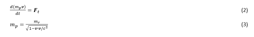 Para modelar la trayectoria de las partículas, se usa una formulación newtoniana (Ecuación 2), y se aplica una corrección relativista a la masa de los protones estudiados (Ecuación 3). La intensidad de la densidad de flujo magnético y la trayectoria de los protones se ve en la Figura 3 (mr se refiere a masa en reposo del protón).
