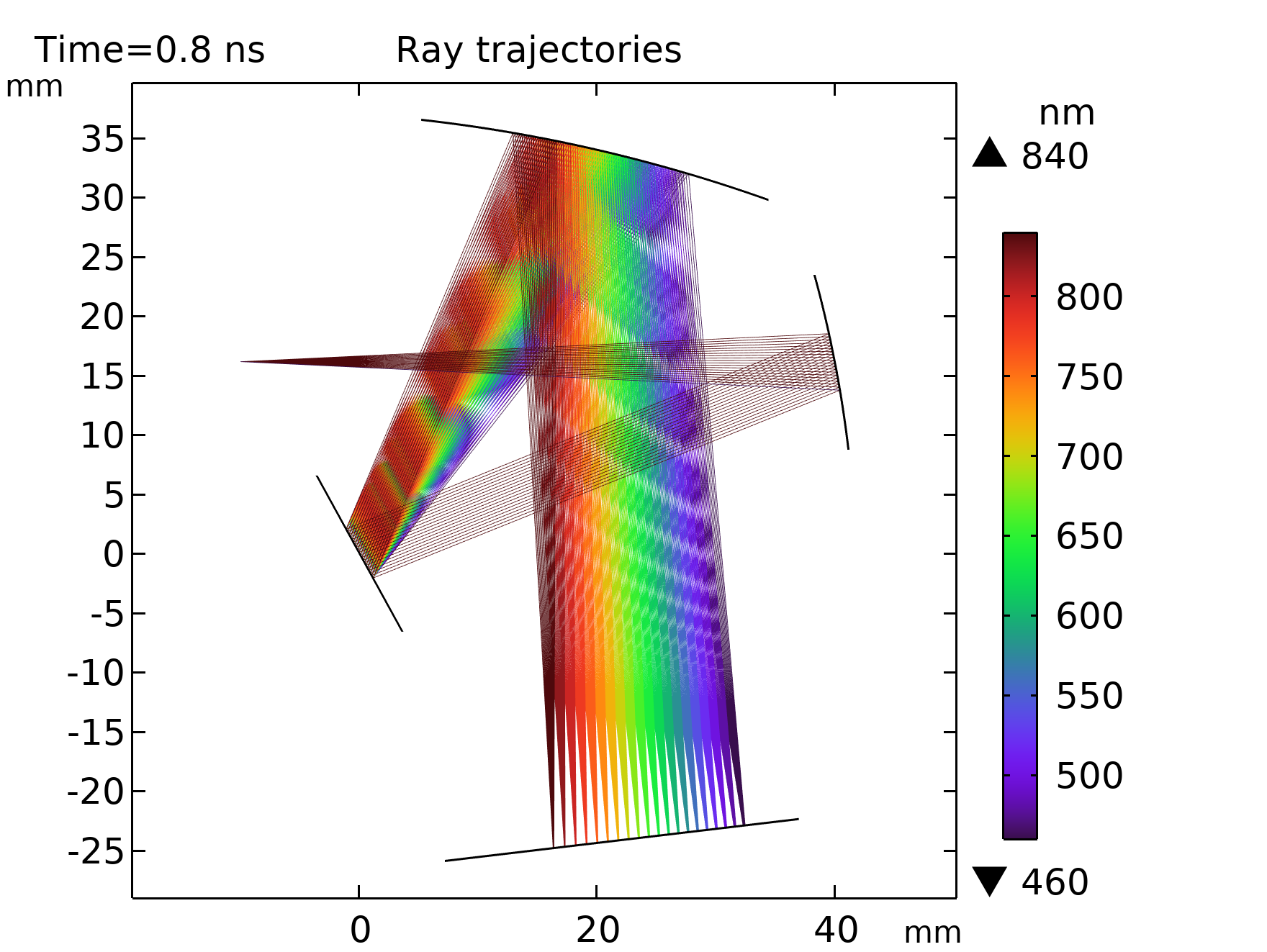 La Figura 2 muestra las trayectorias de los rayos en el espectrómetro. La longitud de onda en espacio libre está indicada por la expresión de color. Después de que los rayos se reflejan por la rejilla, los rayos de diferentes frecuencias se propagan en diferentes direcciones y llegan a diferentes ubicaciones en el detector CCD.
