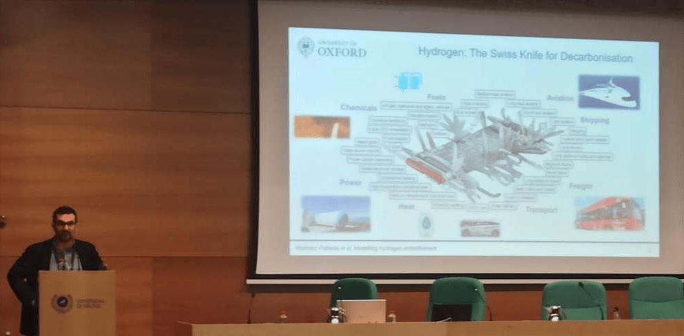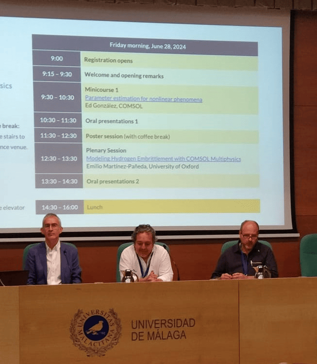 Entre las conferencias plenarias de la mañana ha destacado la exposición del profesor del Dr. Emilio Martínez-Pañeda, profesor de la Universidad de Oxford, con el título "Modeling Hydrogen Embrittlement with COMSOL Multiphysics". En este trabajo, el profesor Emilio Martínez-Pañeda analiza con COMSOL Multiphysics cómo el hidrógeno fragiliza los materiales metálicos, reduciendo drásticamente su ductilidad, tenacidad a la fractura y resistencia al crecimiento de grietas por fatiga. Este comportamiento del hidrógeno supone un serio inconveniente para utilizar el sistema actual de gaseoductos de acero para la distribución de hidrógeno. El trabajo del Dr. Emilio Martínez-Pañeda podría facilitar la búsqueda de posibles soluciones.