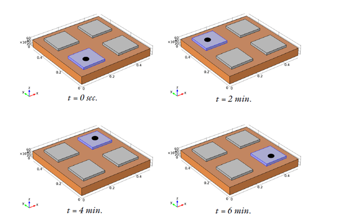 El calentamiento de un objeto desde regiones alternadas es un ejemplo donde la técnica de activar y desactivar la física en dominios puede ser útil. Este ejemplo muestra cómo aplicar esta técnica usando LiveLink for MATLAB [1]. En el modelo se desea estudiar la distribución del calor en una placa grande de cobre calentada por una placa de acero que se mueve entre varias ubicaciones. La placa de acero caliente permanece en cada punto de la base durante dos minutos antes de ser movida al siguiente. En la Figura 1, la placa de cobre se muestra en naranja. Las cuatro ubicaciones de la placa de acero están presentes en la geometría, pero solo una está activa en un momento dado. Se asume que la placa caliente se mueve instantáneamente cada dos minutos, desactivando el dominio anterior y activando uno nuevo. Los dominios activos se muestran en azul y están marcados con un círculo relleno. El calor se transfiere entre la placa de acero, con una temperatura inicial de 500 K, y la placa de cobre a través de una capa delgada con resistencia térmica. La placa de cobre se enfría por el contacto térmico con la capa de resistencia, simulando el proceso de calentamiento en diferentes ubicaciones.
