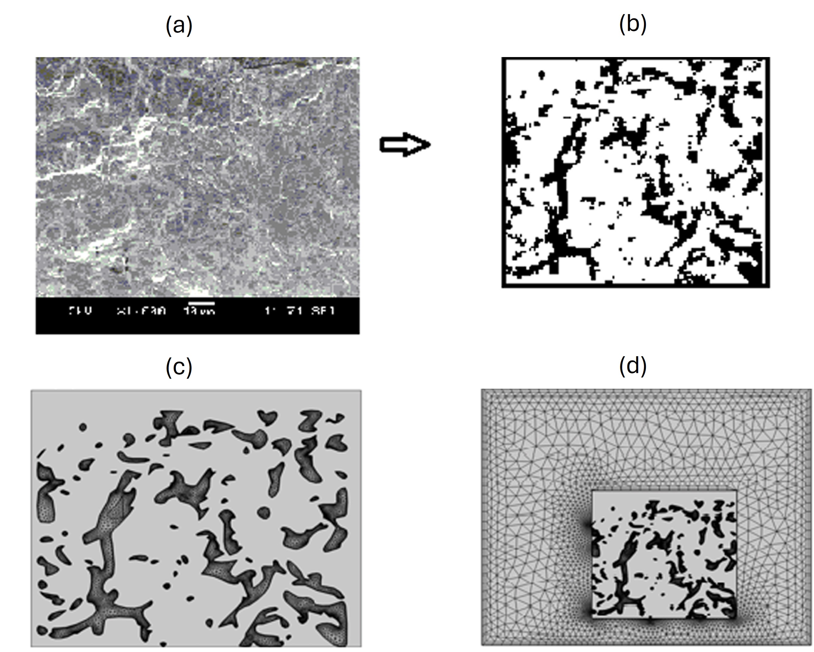 Figura 1. Creación de geometría a partir de imagen SEM. (a) Imagen SEM original de los residuos de vinagre de sidra como medio poroso. (b) Imagen convertida a un mapa binario utilizando el software ImageJ. (c) Malla de elementos finitos dentro de un poro (microcanal). (d) Vaso de precipitados lleno de agua que contiene el residuo de vinagre de sidra.