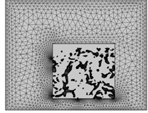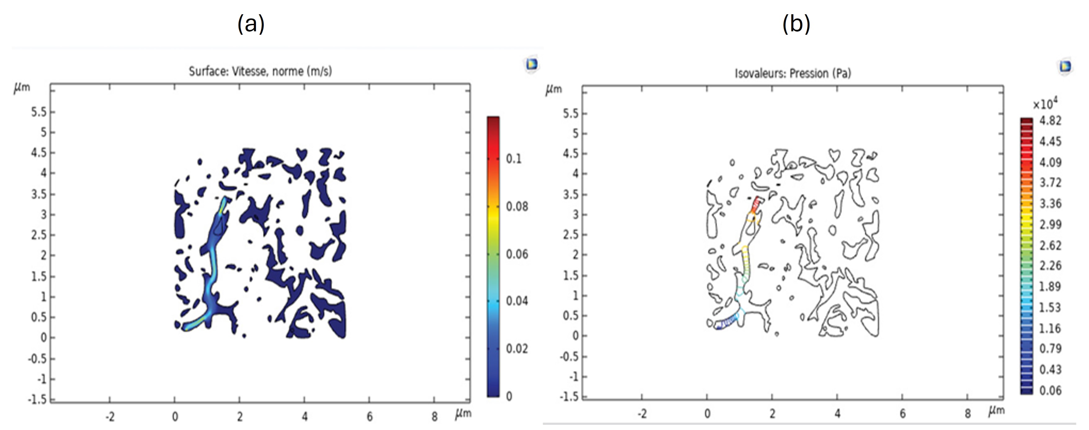 Como se observa en la Figura 2, los resultados indicaron que la velocidad del fluido era máxima en los poros más estrechos (con un máximo de 0.085 m/s), con grandes pérdidas de carga. La velocidad era cero en las zonas donde el medio poroso estaba más compacto, lo que impide el paso del fluido. Este trabajo pone de manifiesto que COMSOL Multiphysics es una herramienta de gran utilidad para llevar a cabo simulaciones numéricas de la evolución de la velocidad y presión en medio porosos morfológicamente complejos.