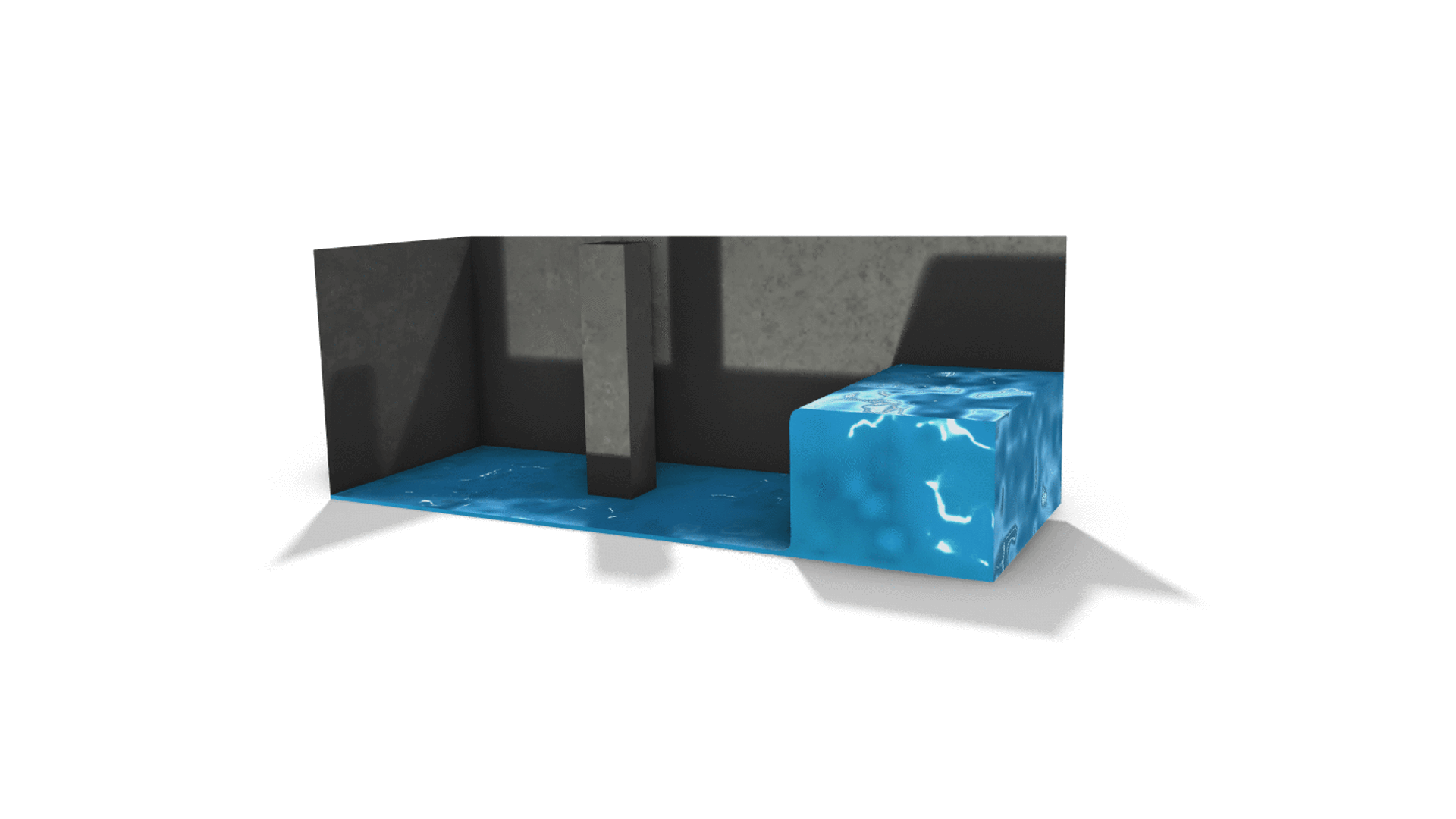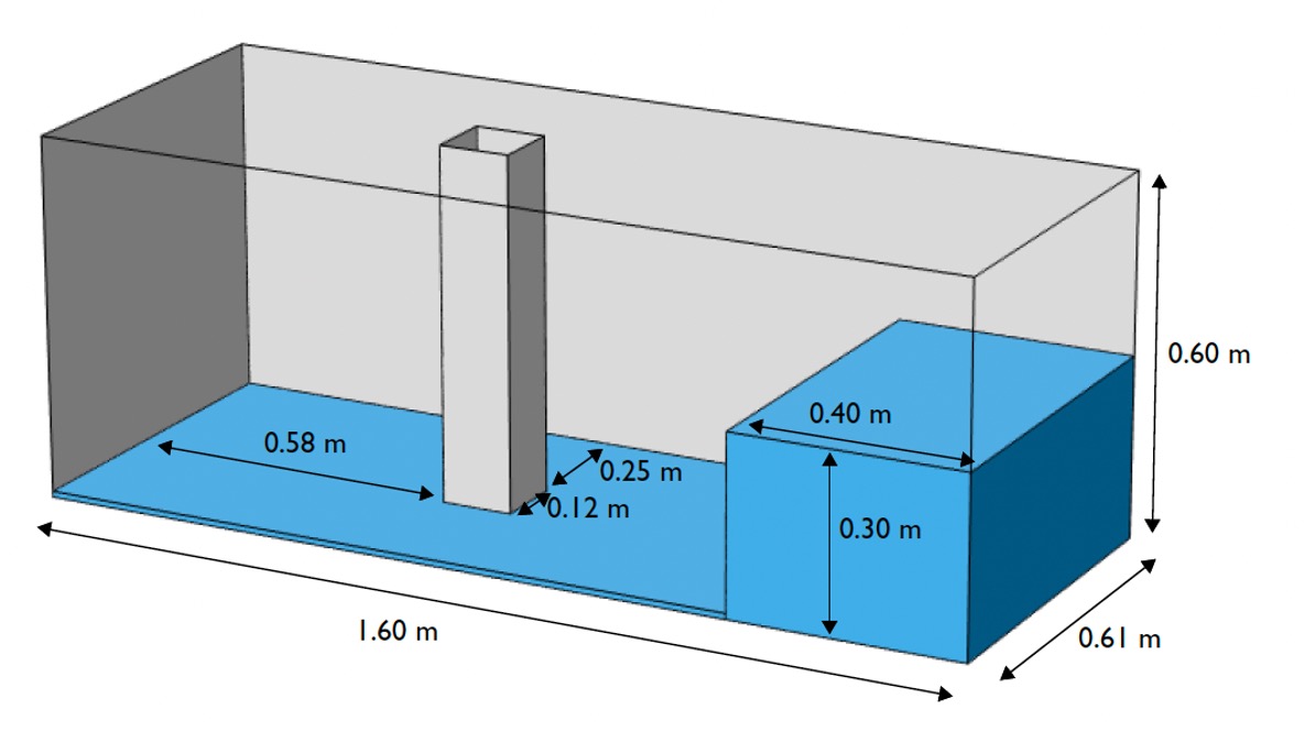 El modelo en régimen transitorio "Dam Breaking on a Column" [1] emplea la interfaz de flujo bifásico en régimen laminar y función de nivel (Level Set) para simular el impacto de una ola de agua sobre una columna. Como se muestra en la Figura 1, un cuerpo de agua de 0.3 metros de altura se encuentra inicialmente contenido detrás de una compuerta. La simulación comienza cuando la compuerta se abre, de forma que el fluido se libera generando una ola que se desplaza hacia la estructura. Después del impacto inicial en la columna, el agua continúa su trayectoria hasta impactar en la pared del tanque, regresando para chocar con la columna una vez más. De este modo, es posible calcular la fuerza que ejerce el agua sobre la columna y puede compararse con medidas experimentales.