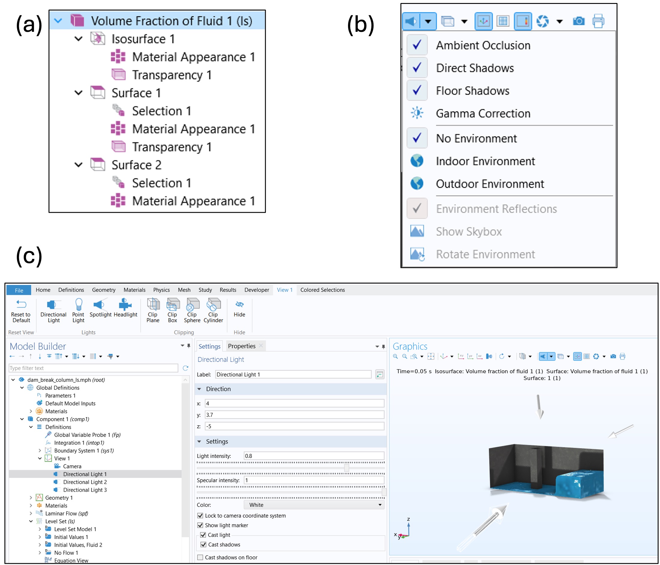 La modificación de la escena visual en COMSOL Multiphysics® se realiza desde el nodo "View 1" que se muestra en la Figura 3 (c). En este nodo, es posible añadir diferentes tipos de luces, así como modificar su posición, intensidad y color. Se pueden crear diferentes vistas que pueden seleccionarse posteriormente en las figuras de postprocesado.