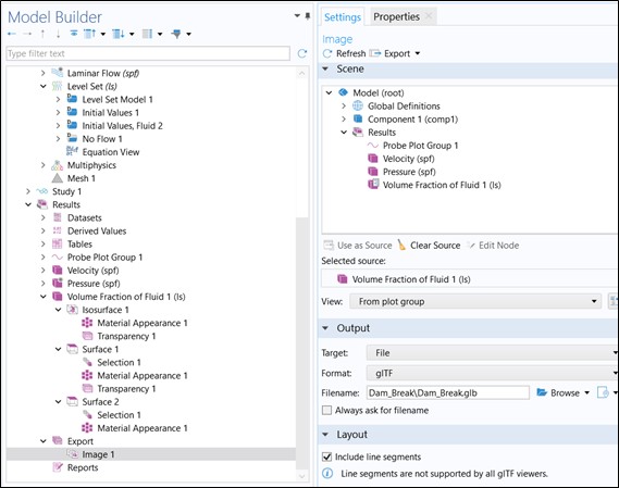 Para comenzar, en el entorno de COMSOL Multiphysics®, despliega la sección de “Results” en el Constructor de modelo. Con el botón derecho, selecciona “Exportar”. A continuación, selecciona “Image” tal y como se muestra en la Figura 1. En los ajustes que aparecerán, se elige el gráfico que interese y, en “Output”, selecciona Archivo y el formato glTF. Busca el directorio donde deseas guardar el archivo, asigna un nombre y, por último, haz clic en el botón Exportar en la parte superior. Esto generará una escena 3D del gráfico, que podrás importar a Blender.