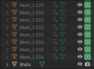 Cabe mencionar que, para optimizar el proceso, primero se debe exportar una imagen de escena 3D que contenga únicamente los elementos constantes en toda la animación, como las paredes sólidas. Después, se ejecutará el script para las escenas que solo contienen los gráficos en movimiento. De esta manera, al importar a Blender, se obtendrá un único objeto para las paredes y diferentes objetos para cada paso de tiempo de los gráficos animados. La Figura 3 muestra un único objeto “Walls” que permanece visible durante toda la animación en Blender, mientras que hay un objeto “Mesh” para cada paso de tiempo.