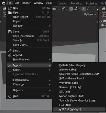 Figura 4. Forma de importar “import” imágenes con formato “glTF” en Blender.