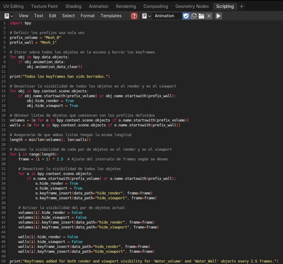 A continuación, se aconseja ejecutar el script en Python que se muestra en la Figura 5, que ocultará todos los objetos que comienzan con el prefijo Mesh, de modo que solo se visualicen una única vez en un fotograma específico. Para acelerar o ralentizar la animación, se puede modificar el valor de 2.5 en la línea 29 del código que se muestra en la Figura 5. Valores más altos harán que la animación sea más lenta, mientras que valores más bajos la harán más rápida.