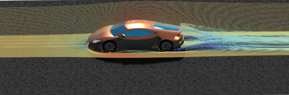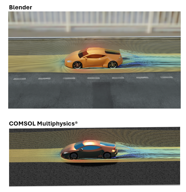 Figura 8. Gráfico y líneas de corriente en el modelo “Sports car” obtenidos en Blender y COMSOL Multiphysics®.
