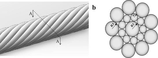 Figura 1. Muestras de cable: (a) vista estereoscópica, (b) vista en sección (alambre central R1 = 2.95 mm, alambre helicoidal R2 = 1.6 mm, alambre helicoidal R3 = 2.95 mm).