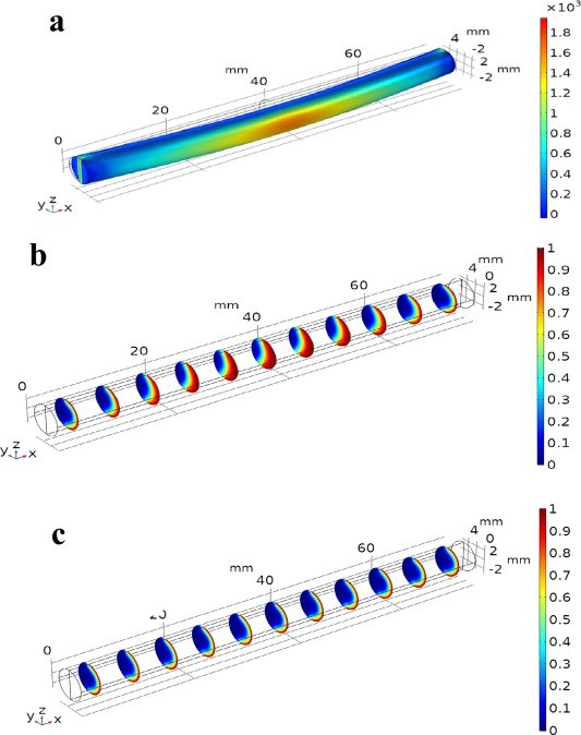 Figura 2. Distribución de hidrógeno: a) distribución de esfuerzo de Von Mises (MPa), b) bajo esfuerzo, y c) sin esfuerzo.