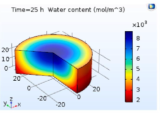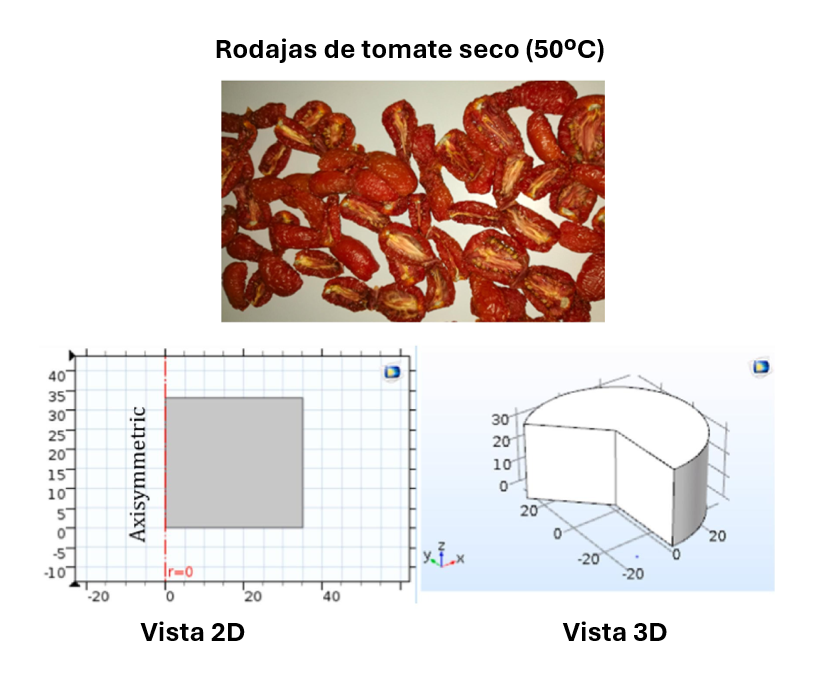 El modelo numérico axisimétrico desarrollado en COMSOL Multiphysics® para las rodajas de tomate (Figura 1) acopla las físicas de transferencia de calor en sólidos y transporte de especies diluidas en medios porosos. Para representar la geometría de las rodajas de tomate, se utilizó un cilindro axisimétrico de 35 mm de radio y 22 mm de grosor. Las ecuaciones principales se basan en la segunda ley de Fick para el transporte de agua y en la conducción de calor dentro de la rodaja. Entre las simplificaciones asumidas destacan: