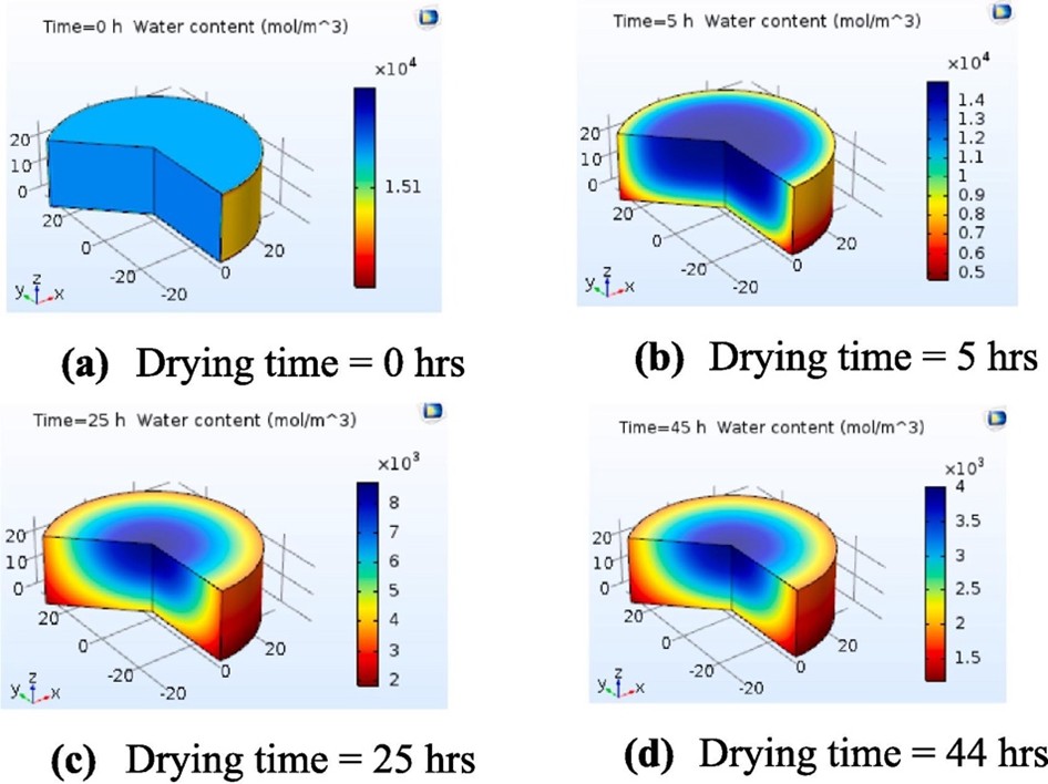 Figura 2. Contenido en agua de las rodajas de tomate calculado en COMSOL Multiphysics® para distintos tiempos de secado.